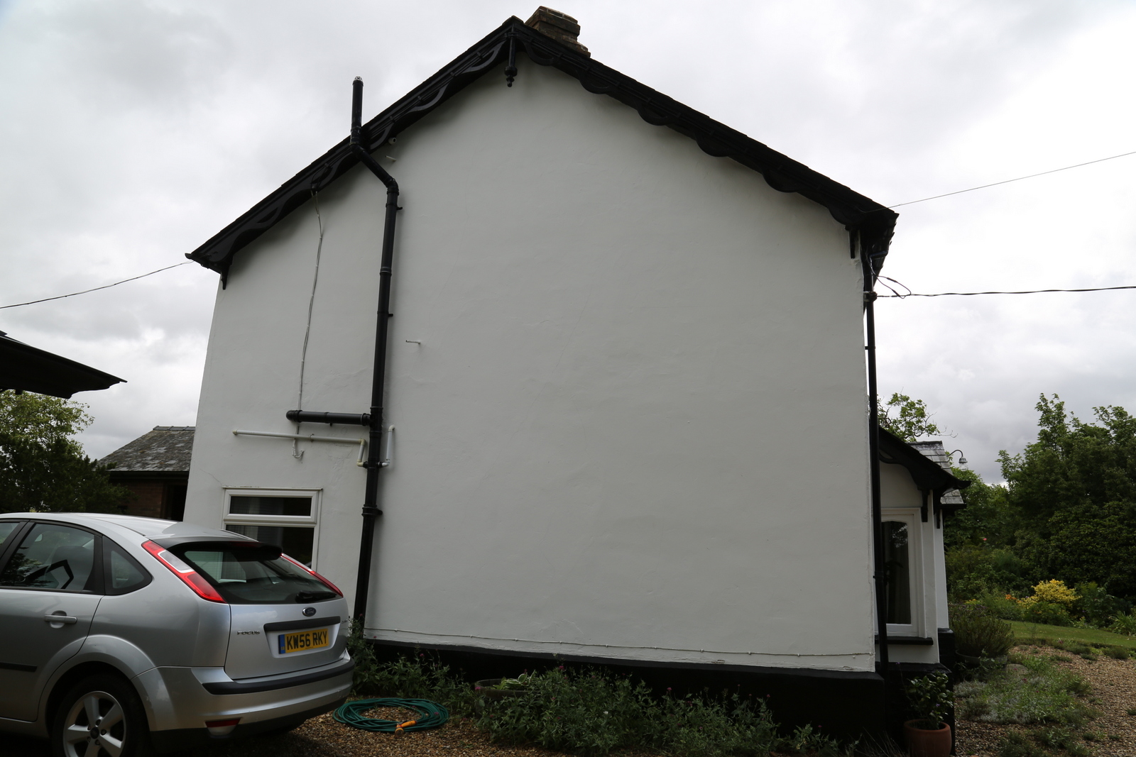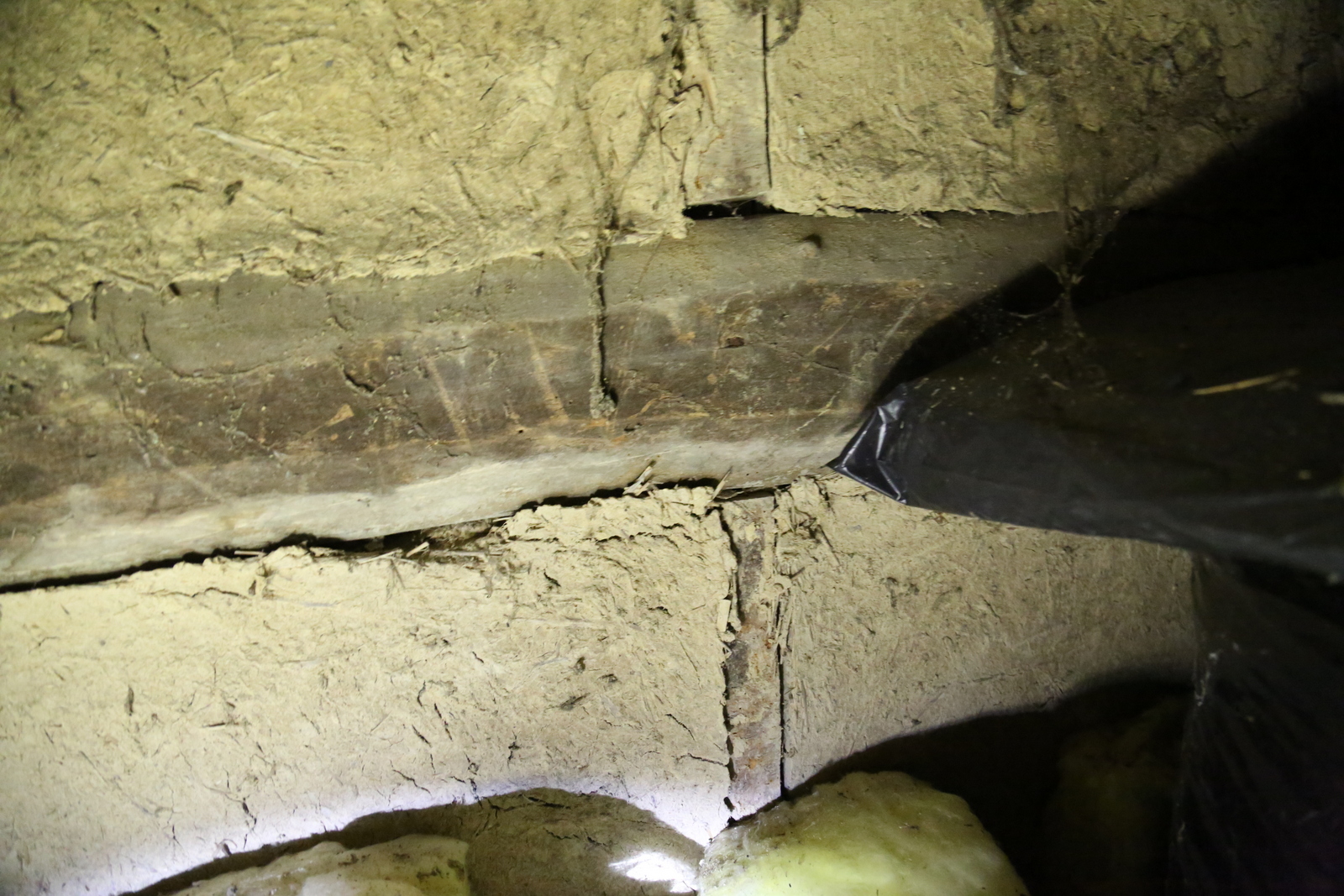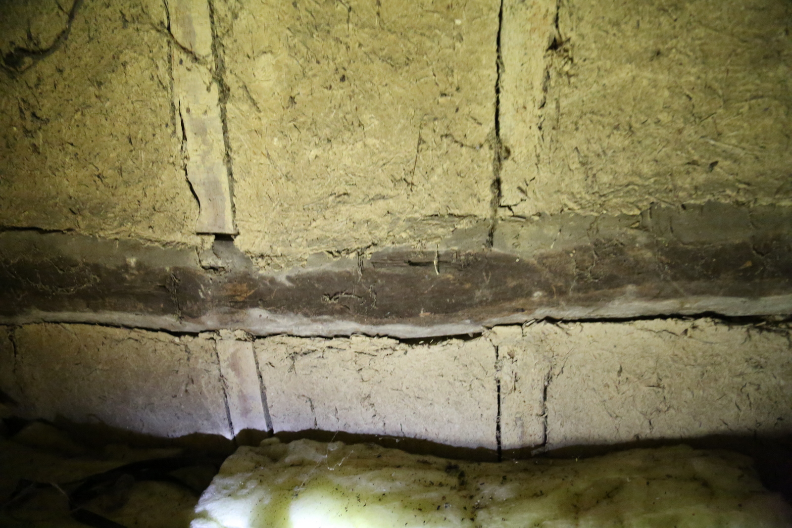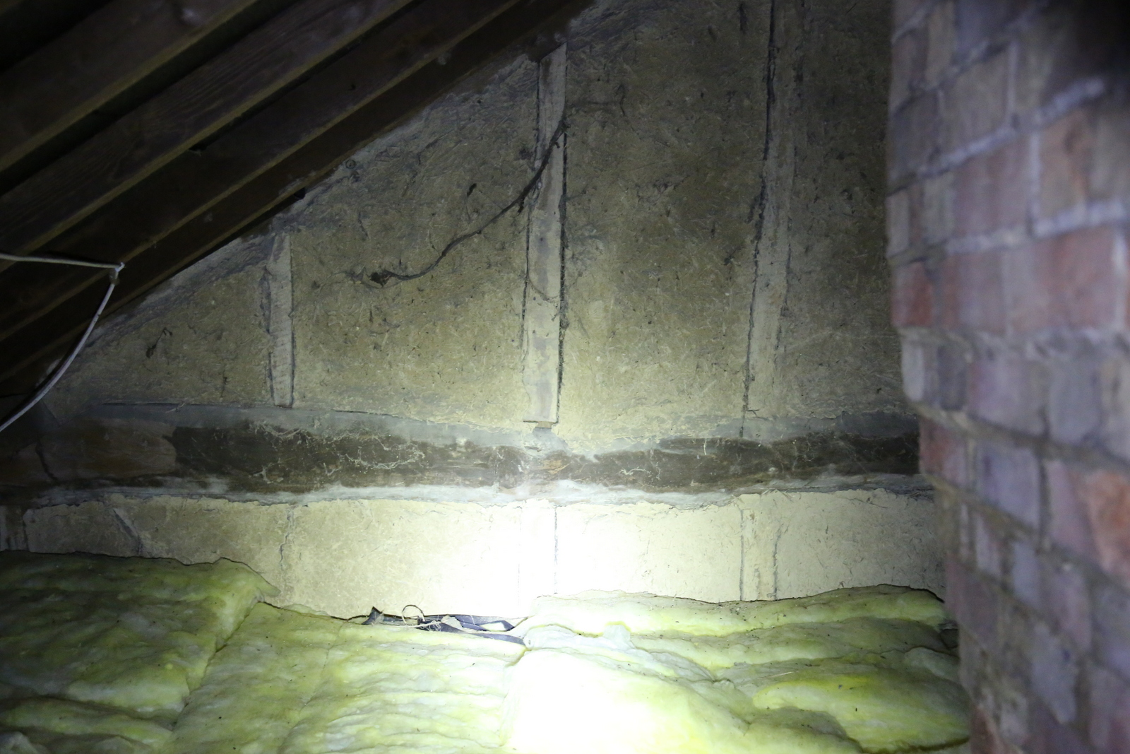 Then I went into the roof space and found the timber frame, infilled with the most magnificent chopped straw / lime / daub mix. I've never seen anything like this before - internally it was still lime plastered. Externally it's cement render - so we aren't sure whether it will have deteriorated at lower levels, but everything seems to be bone dry.