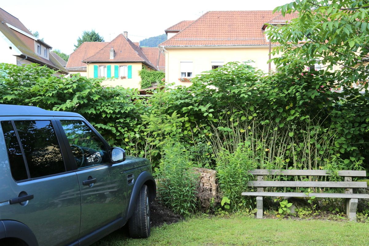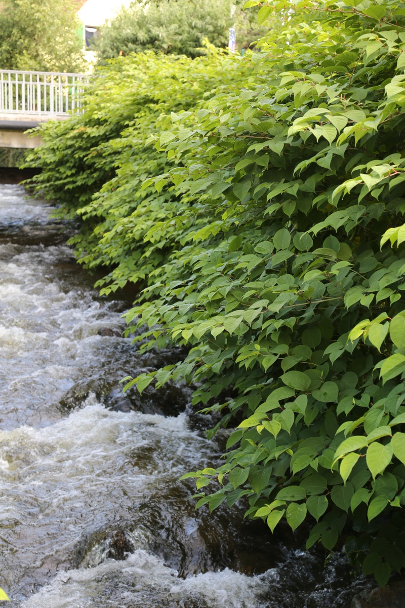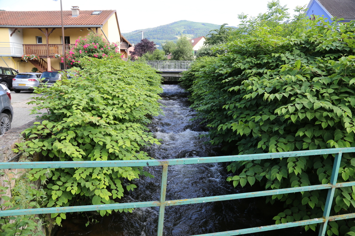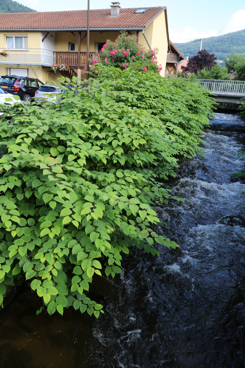 The photos below are taken in France, where Pete stays in the Alsace. The river running through the village of Ste Marie Aux Mines is choked with Japanese Knotweed - these photos show just how strongly it grows.